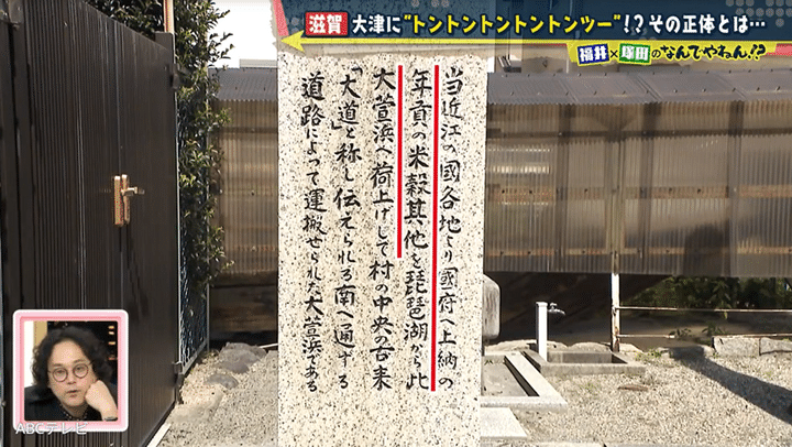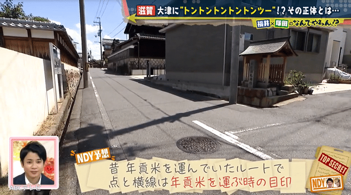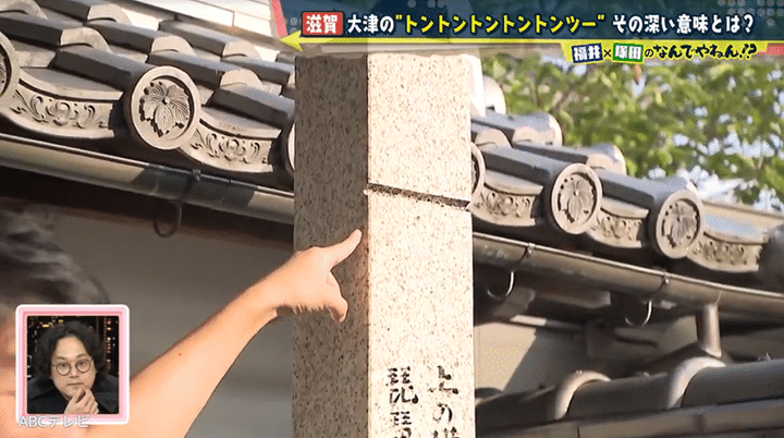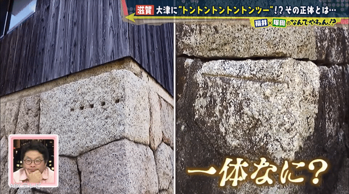 トントントントントンツーの石垣があるのは、琵琶湖畔近くの大萱五丁目交差点。石垣には、高い位置に謎の点が5つ、少し離れた場所の低い位置に横線が1本刻まれている。「モールス信号じゃないの?」「SOSだったり」と塚田がひらめくと、福井アナは「それじゃないですか!? 正解じゃないですか!?」とハイテンションになった。