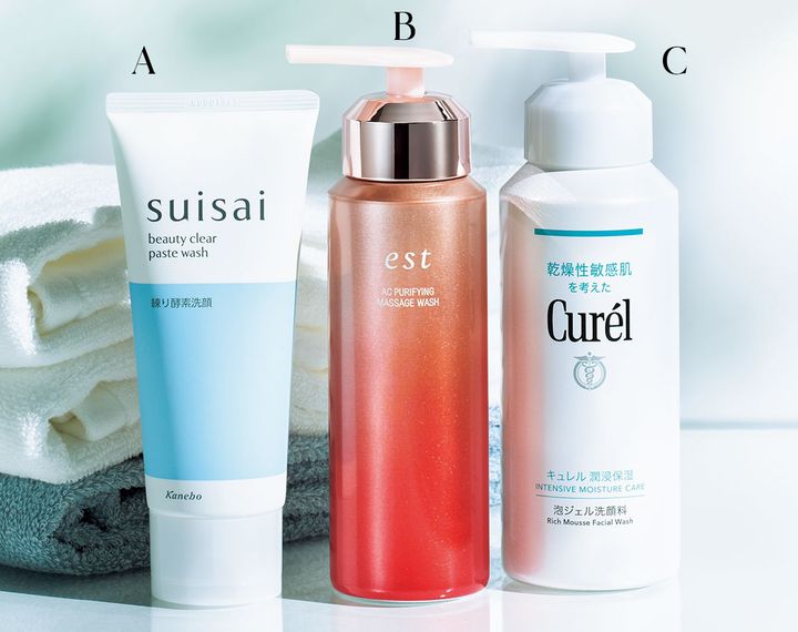 A 【酵素で皮脂&毛穴詰まり対策】グリチルリチン酸2K配合。化粧水成分100%の泡洗顔。スイサイ ビューティクリア ペーストウォッシュ 120g ¥1,430 ※9/20発売〈編集部調べ〉(カネボウ化粧品)B 【炭酸泡で毛穴&くすみ対策】マイクロ炭酸泡でマッサージ。毛穴もくすみもスッキリ。AC ピュリファイ マッサージウォッシュ170g ¥4,950(エスト)C 【炭酸泡で皮脂くすみ対策】2種の酵素と2種のクレイ、皮脂洗浄成分が密着して一掃。キュレル 潤浸保湿 泡ジェル洗顔料[医薬部外品]200g ¥2,090〈編集部調べ〉(花王)