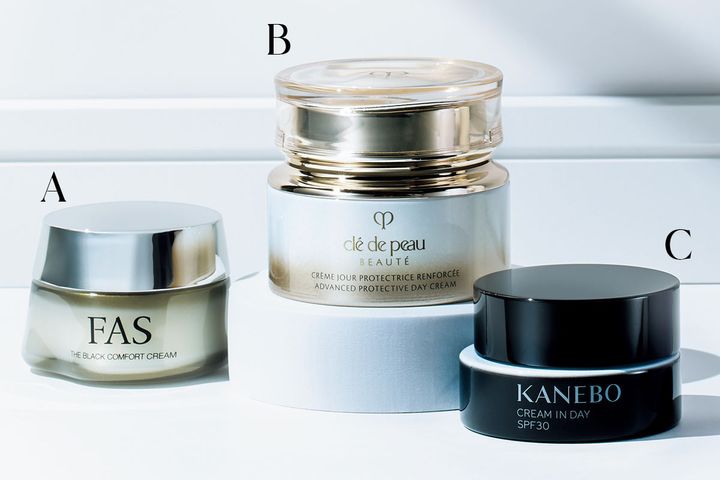 心地よい感触と美肌キープを両立できる朝クリーム。A 【黒米発酵液+夏肌特化成分】アイコン成分のほか夏のための美容成分を厳選。バリア機能をアップ。FAS ザ ブラック コンフォート クリーム 50g¥15,140 ※数量限定(シロク)B 【米麹発酵エキスと新浸透技術】重点的な潤いケアでハリ・弾力が高まる昼の肌リズムを援護。 クレームプロテクトゥリス R(ジュール) 50g ¥16,500(クレ・ド・ポー ボーテ)C 【新「擬似胎脂成分」】胎脂着想の朝クリームが刷新。重ねるファンデに絡まるように密着。カネボウ クリーム イン デイII SPF30・PA+++[医薬部外品] 50g ¥12,500(カネボウインターナショナルDiv.)