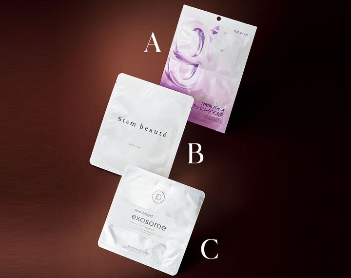 シートマスクなら成分を密封することができ、浸透率が高まります。A NMN配合・上下別のシートで夜20分間の特別ケア。numbuzin 9番NMNバイオリフトラッピングマスク 1枚 ¥330 4枚入り ¥1,250(BENOW)B 肌の明るさとメイクのりの良さが叶う〝ヒト幹〟マスク。facial mask(1枚入り)25ml ¥2,500(ステムボーテ)C 高濃度美容乳液たっぷりでやさしく肌を包む。ドクタールルルン スキンブースト EX マスク 1枚入り 30ml ¥1,320(Dr.ルルルン)