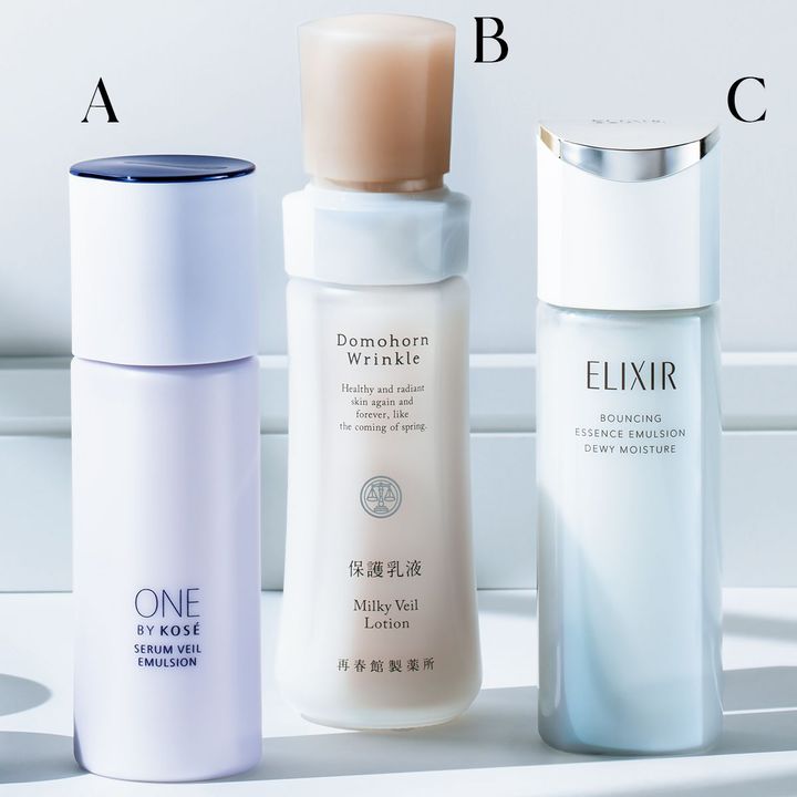 高保湿力なのに表面はベタつかない乳液なら、朝も心地よくケアできます。A 【ライスパワー®No.7】皮脂分泌を促進する効果で表皮の乾燥を改善する発想。 ONE BY KOSÉ セラムヴェール エマルジョン 135ml ¥3,850〈編集部調べ〉(コーセー)B 【漢方発想の複合発酵エキス配合】皮脂バランスを整えバリア機能を徹底強化。 ドモホルンリンクル 保護乳液 100ml ¥5,500(再春館製薬所)C 【最新コラーゲン研究による独自機能成分】内側からハリと保湿をキープし毛穴をカモフラージュ。 リフトモイスト エマルジョン みずみずしいタイプ ba [医薬部外品] 130ml ¥3,960〈編集部調べ〉(エリクシール)
