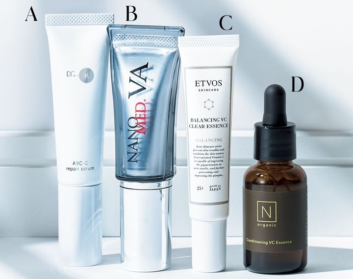 A 【レチノール誘導体とビタミンB・C】A反応が起きにくい処方でもつるんとしたハリのある肌に。 ABC-Gリペアセラム 25ml ¥8,250(ドクターケイ)B 【純粋レチノール】独自成分により肌表面に残りづらいから朝もコラーゲン強化できる。 ナノメッド VAエッセンス 16g ¥7,150 ※医療機関専売品(ナノエッグ)C 【ビタミンC誘導体とアゼライン酸誘導体】有効成分入りジェル美容液で繰り返す肌悩みを予防。 バランシングVCクリアエッセンス25g ¥3,300(エトヴォス)D 【A・C・E のトリプルビタミン】高め合う働きでキメが気になる乾燥ぐすみに効果的。 N organic Basic コンディショニングVC エッセンス30ml ¥8,580(シロク)