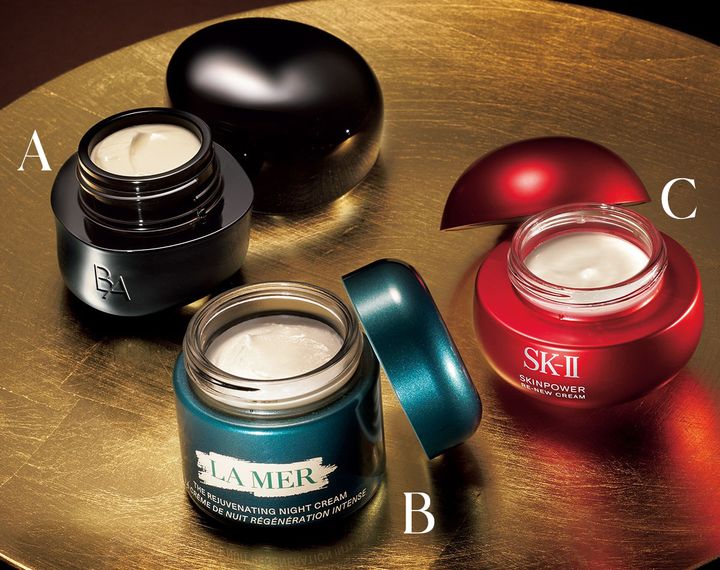 研究技術力が導く独自成分で、エイジングサインの根本原因に対処。A 翌朝のハリ感に満足できる引き上げ力。B.A クリーム 30g ¥38,500(ポーラ)B 敏感肌でもOKな「海由来のレチノール」で肌の底上げを。ザ・モイスチャライジング ナイト クリーム 60ml ¥69,520(ラ・メール)C リッチだけどベタつかない心地よさ。マッサージもお勧め。スキンパワー リニュー クリーム 50g¥18,700 ※9/20発売〈編集部調べ〉(SK-II)