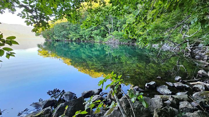 農場では、牛たちがすでに活動を始めていて、私の姿を見かけると近づいてきたり、目の前をキタキツネが横切っていったり。明るくなった空の下、青々とした湖に木々の緑が映え、とても美しい絶景だった。