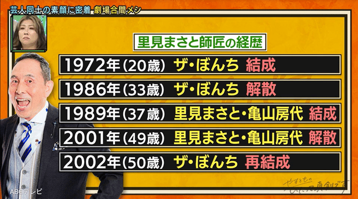 絶望していたまさとが再び立ち上がるきっかけとなったのは、今は亡き亀山房代さんとの出会い。当時37歳だったまさとは、22歳の亀山さんと里見まさと・亀山房代を結成。年の差男女コンビとしてまた一から漫才に取り組んだ結果、46歳の時に上方漫才大賞の大賞を受賞した。まさとにとって大賞受賞は、ザ・ぼんち以来2度目だった。その後に里見は、亀山さんの結婚と出産をきっかけにコンビを解散。当時まさとは49歳だった。