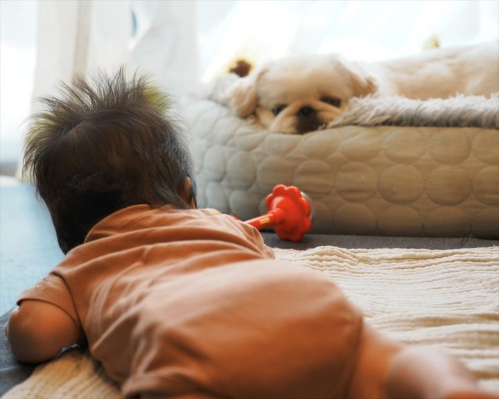 赤ちゃんの隣にいる愛犬。 赤ちゃんの成長を見守るように一緒にいてくれるその姿が反響を呼んでいます。