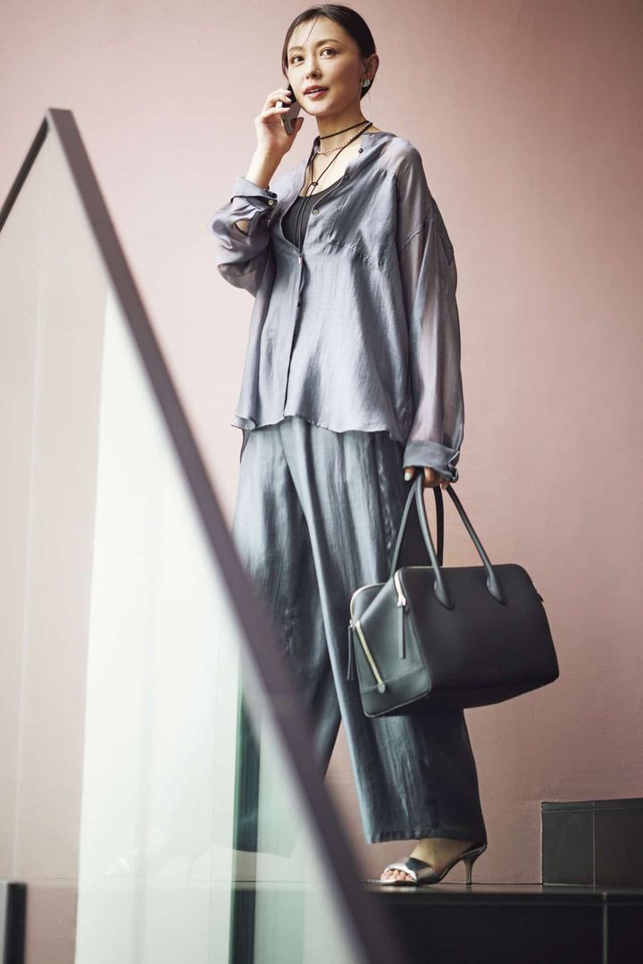 シアーなシャツなら長袖でも堅苦しくないのがポイント。リラクシー感を出しつつ、ツヤのある素材で大人らしく上品に仕上がります。
