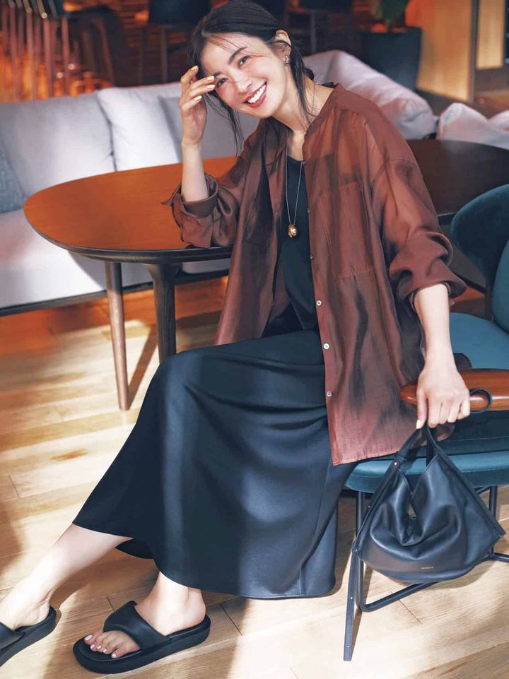 シャツ¥25,300(HER.)ワンピース¥30,800(K.T KIYOKO TAKASE/ファイブフォックス カスタマーサービス)バッグ¥35,200(オルセット/プルミエ アロンディスモン NEWoMan新宿)サンダル¥27,500(カミナンド/グラビテート)イヤリング¥7,830(アビステ)ネックレス¥42,900(ミショー/ハウス オブ ロータス)