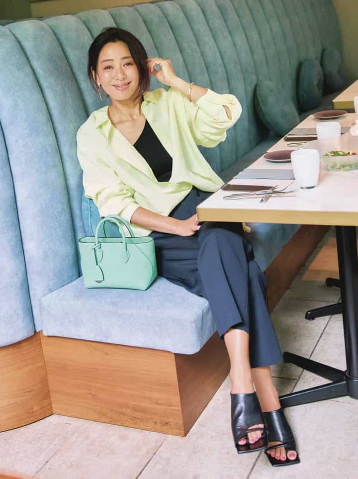 シャツ¥9,990(PLST)ワンショルダータンク¥13,200(LE PHIL/LE PHIL NEWoMan 新宿店)ネイビーパンツ¥29,700(フィーニー)バッグ¥169,400(BONAVENTURA/ボナベンチュラ カスタマーサポート)ミュール¥18,700(ルタロン グリーズ/ル タロン グリーズ ルミネ新宿店)ピアス¥39,600チェーンブレスレット¥70,400スクエアリング¥26,400リング¥50,600(すべてブランイリス/ブランイリス トーキョー)