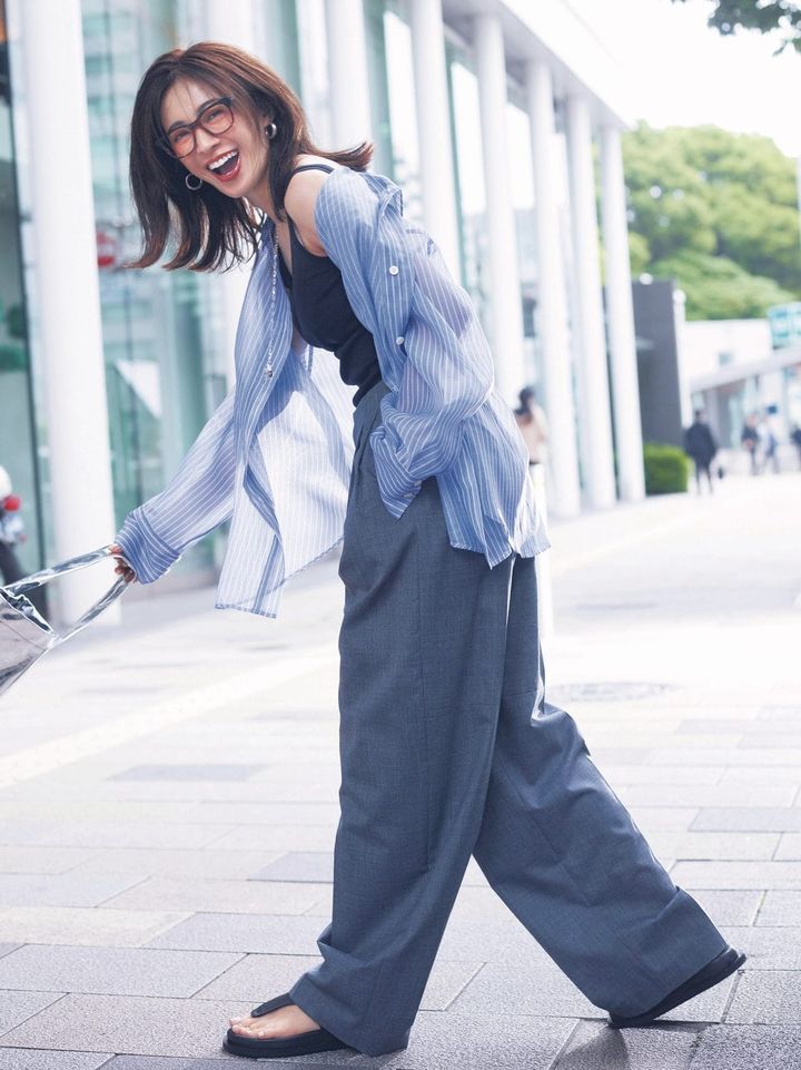 オーガンジーシャツ¥19,910(FRAY I.D/FRAY I.D ルミネ新宿2店)タンクトップ¥17,600パンツ¥35,200(ともにアイレネ/ルシェルブルー総合カスタマーサービス)バッグ¥14,080(バーセルフ)サンダル¥15,400(ワースタジオ/アルアバイル)ピアス¥23,100(ニナ・エ・ジュール/ショールーム ロイト)ネックレス¥75,900(リューク)メガネ¥28,600(ブラン/ライト)