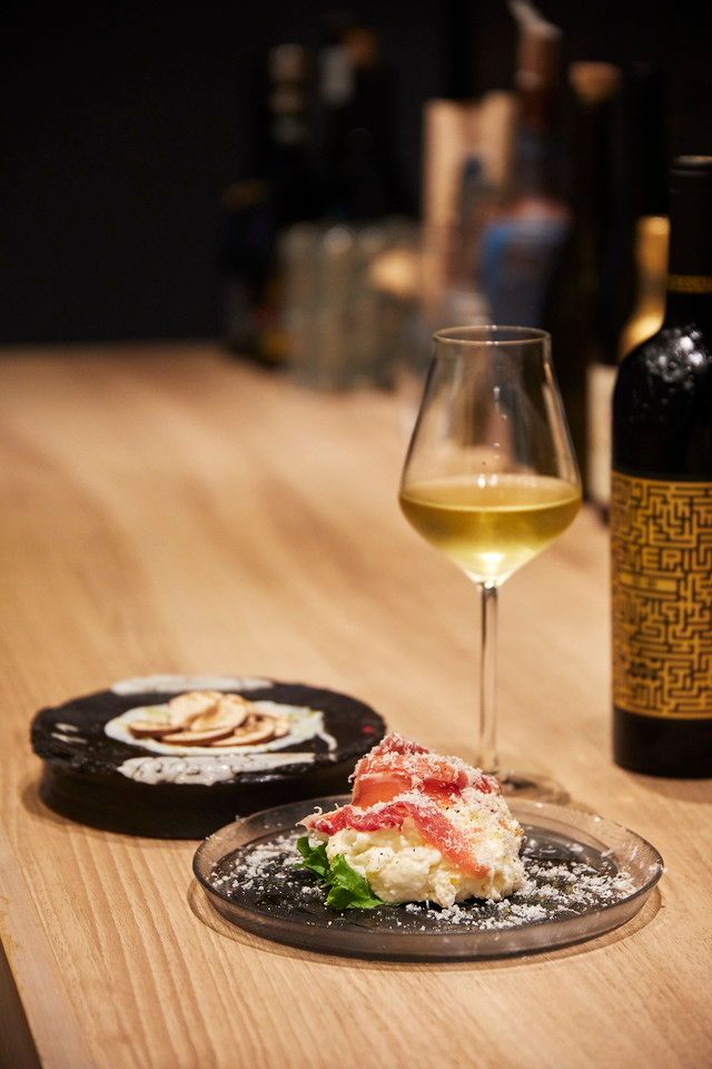 もう一品の「生ハムチーズのポテサラ」は、女性に人気の高いひと皿。じゃがいものみをメレンゲと合わせてふわふわ食感に仕上げており、チーズのコクと生ハムの塩味がおいしいアクセント。どちらのメニューもワインにぴったりなので、お好みの一杯とともに召し上がれ!