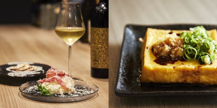 (左から)「マッシュルームのカルパッチョ」660円、「生ハムチーズのポテサラ」580円、「グラスワイン(ミステリウム・ホワイト)」