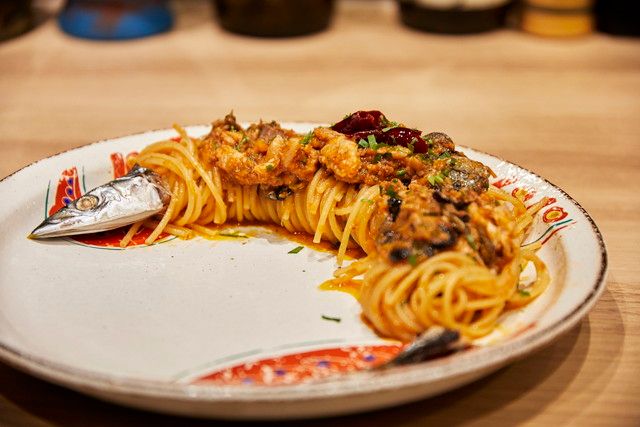 遊び心あふれる盛り付けで登場したのは、秋におすすめのパスタ「サンマのプッタネスカ」です。焼いたサンマの身をにんにく、オリーブ、ケイパー、鷹の爪、そして自家製のトマトソースと合わせたパスタは、ピリッとした辛味とサンマの旨みが存分に楽しめます。