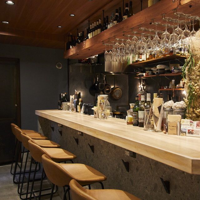 入り口すぐのカウンター席は、ひとり飲みの特等席。目の前にずらりと並んだボトルやキッチンの様子を眺めながら次に注文する料理を決めるなど、わくわくした時間が過ごせます。ひとり飲みの一軒目にも、ラストのお店としても、重宝しそうです。