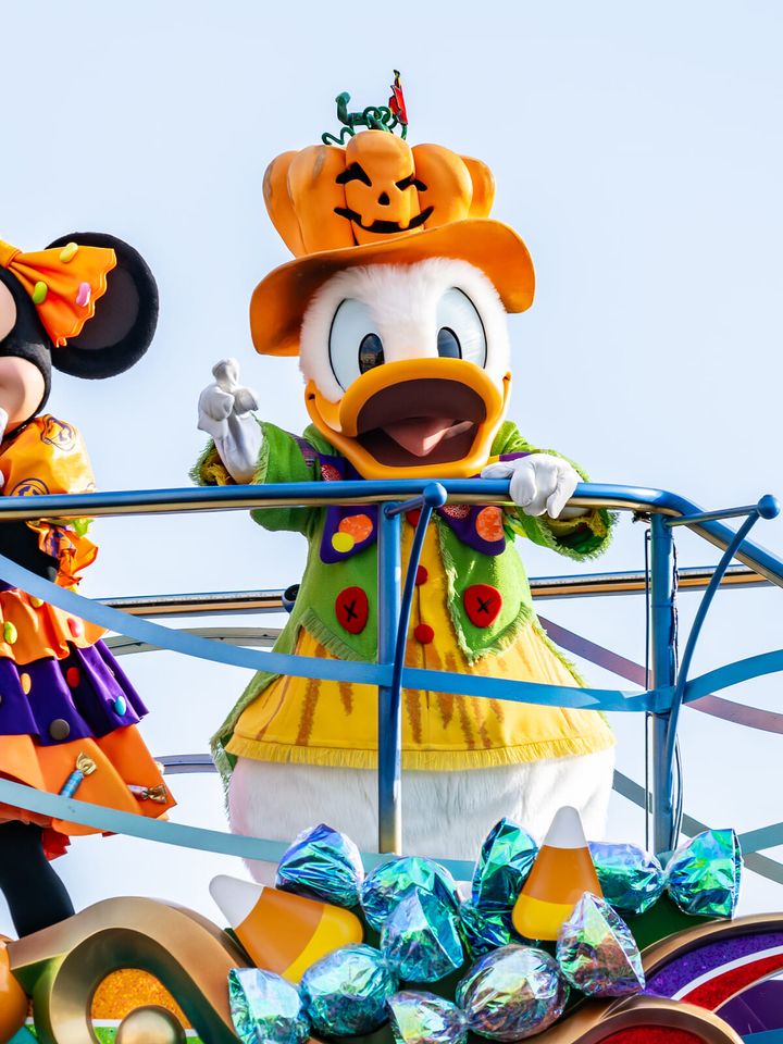 「ドナルドダック」は、お菓子をイメージしたカラフルな衣装にカボチャの帽子をコーディネート。