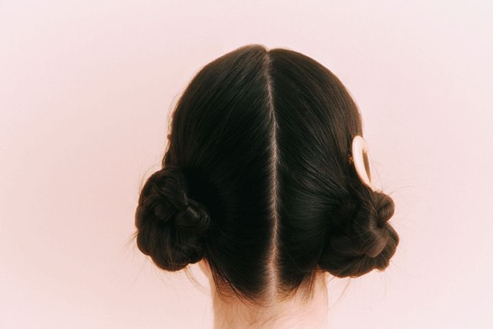 結んだ毛束をきつめに三つ編み、ねじって根元に巻きつける。細ゴムでおだんごをつくる。