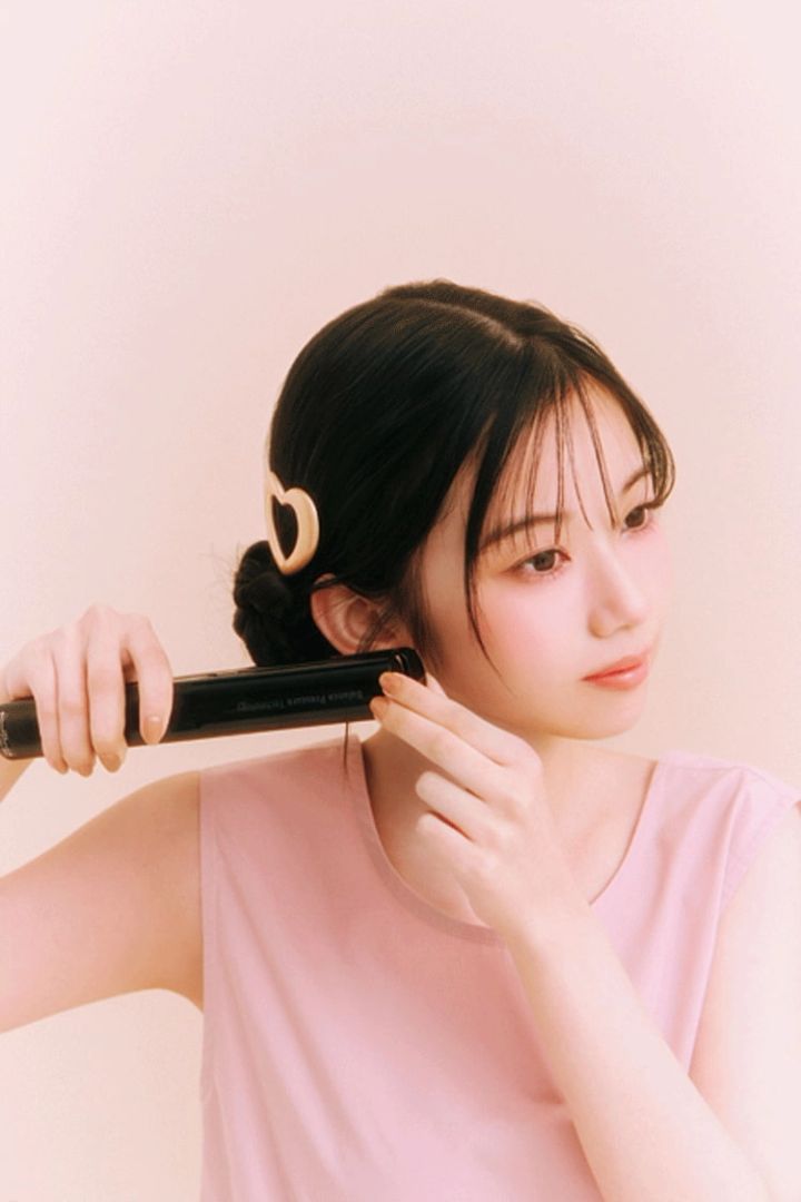 顔まわりのおくれ毛を顔に沿わせるように、ストレートアイロンをまっすぐ通す。