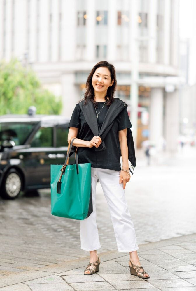 「この『BOSS』の白パンツは股上が深くてはきやすく、抜け感が出る丈の長さが気に入っています。冷房が苦手なので、『プラダ』のブルゾンを肩がけしました。グリーンと黒のバイカラーの大きなPVCバッグは『マルニ』。服がシンプルなのでアクセントにしています」。Tシャツは『ジョゼフ』。