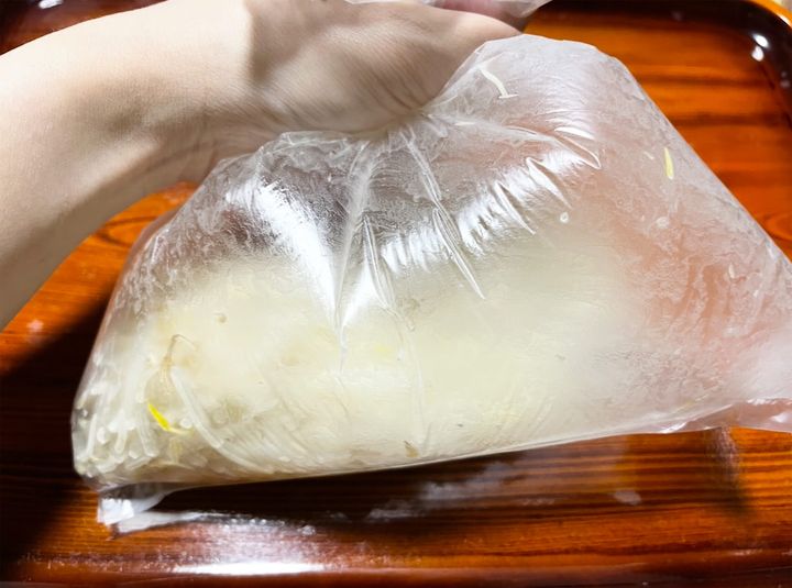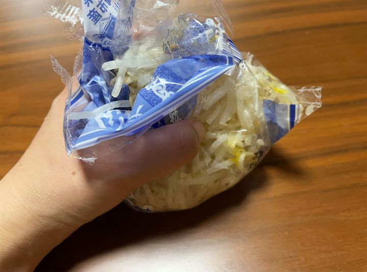 1. もやしの袋の口を開け、手で揉んで2〜3cmの長さに折ります。