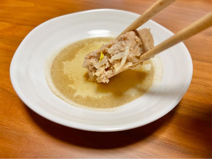 もやしをたっぷり使っていますが、豚肉の旨味をしっかり感じます。噛みしめるたびに、もやしのシャキシャキ食感がいいアクセントに。卵もパン粉も入っていませんが、ふんわりやわらかくて、口の中でほろっと崩れる感じがたまりません♡