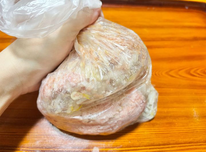 3. 2にひき肉、オイスターソース、塩、こしょうを入れ、袋の上からよ〜く揉んで、肉だねを作ります。