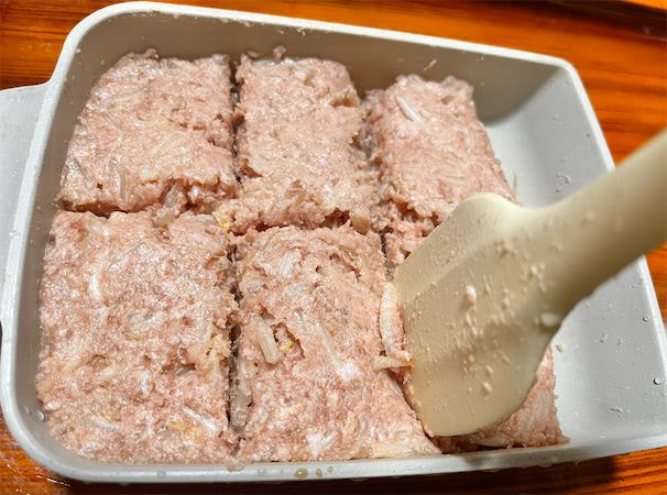 4. 小さめのフライパンに3の肉だねを入れ、表面を平らにします。切り分けやすいよう、シリコンヘラで切れ目を入れておきましょう。