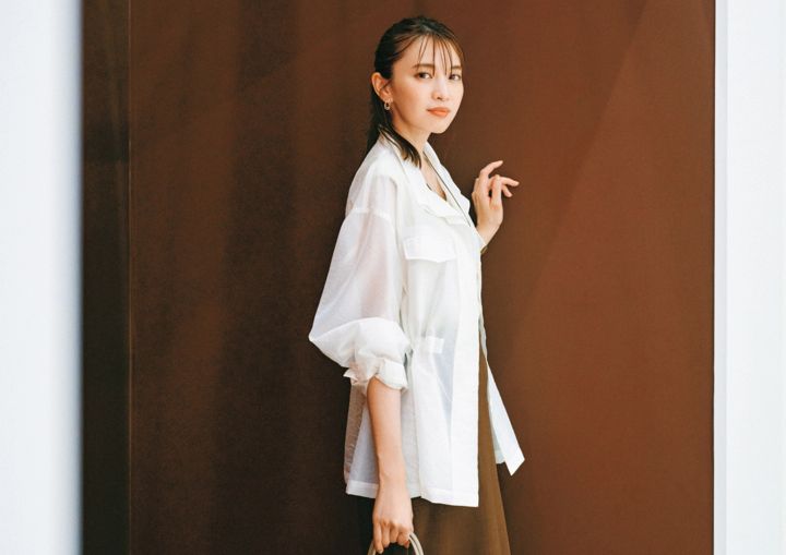 2WAYシアーシャツアンサンブル(ニット)¥19,800/アプワイザー・リッシェ シアーブルゾン¥37,400/アンクレイヴ(オンワード樫山) タイトスカート¥5,489/ロペピクニック(ジュン) ブラウンパンプス¥19,250/ダイアナ(ダイアナ 銀座本店) トートバッグ¥13,000/PLST 時計¥40,700/ココシュニック ダブルリングネックレス¥7,920/アンタイトル メタルコンビイヤリング¥2,200/Three Four Time(ジオン商事) ポーチ/編集部私物