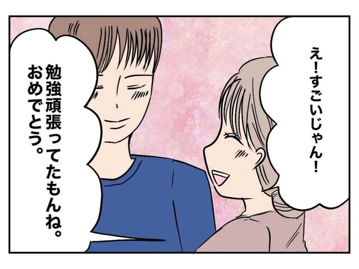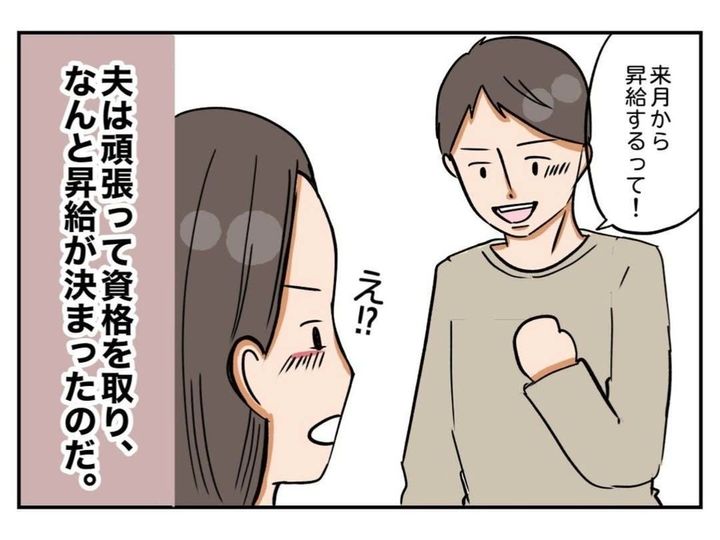 同じように資格の勉強をし、結果としては同じように昇給を果たしたメイカの夫とすみれの夫。しかし、その結果に対するメイカとすみれの反応は真逆…。素直に頑張りを褒めることができたすみれの夫はうれしそうな表情をしていましたね。