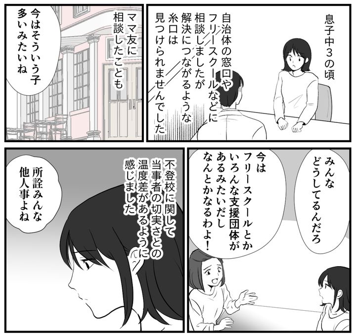 暴れる弟の姿を見た娘のミユも、限界を感じたのでしょう。大学進学を機に家を出たいと言ってきました。それまで「今は不登校なんてめずらしくないから。私のまわりにもそれなりにいる」と弟の気持ちに寄り添っていた娘だったのですが……。友人やいろんな機関に相談したこともありましたが、当事者の切実さと、周囲や社会の受け止め方との間に温度差があるように感じました。