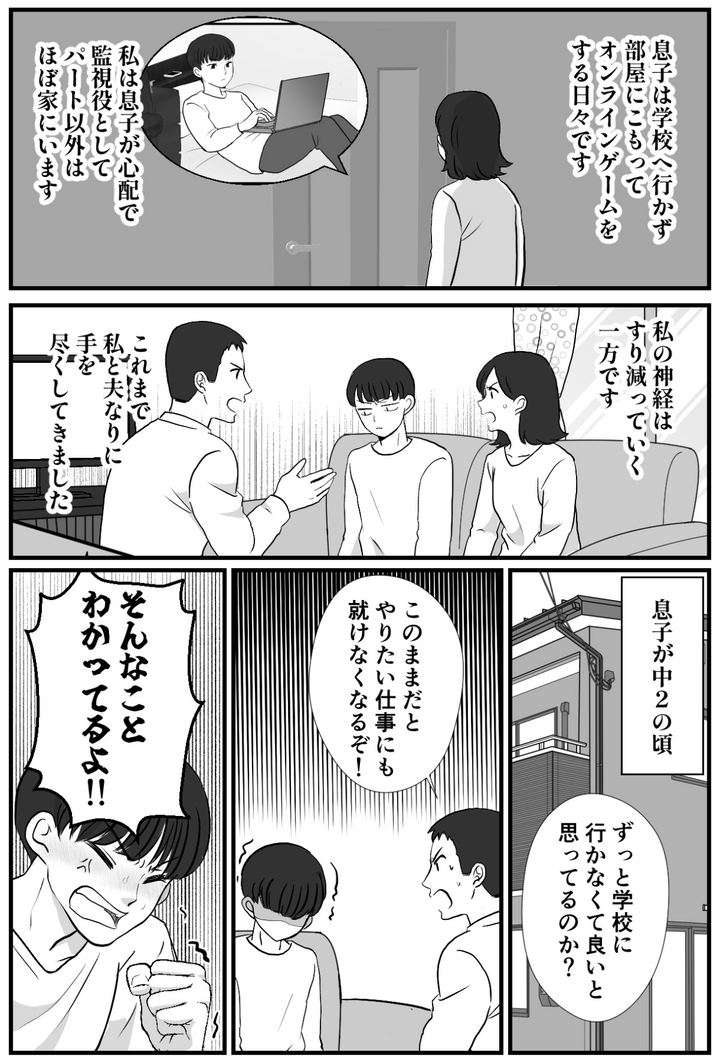 私(ユミコ、40代)は夫(セイジ、40代)と息子(ヒロキ、高校1年生)との3人暮らし。娘(ミユ、大学1年生)は大学進学を機に家を出ました。息子は元々運動神経がよく、中学1年生の途中までは学校のテストでいい成績を収めていました。しかし息子は不登校になり、高校へ進学しても自室にこもってゲーム三昧の日々を送っています。私と夫が何をしても状況は改善せず、私は日に日に息子への愛情が減る一方です。「高校だけは出てほしい」という私の願いも薄れてきました。