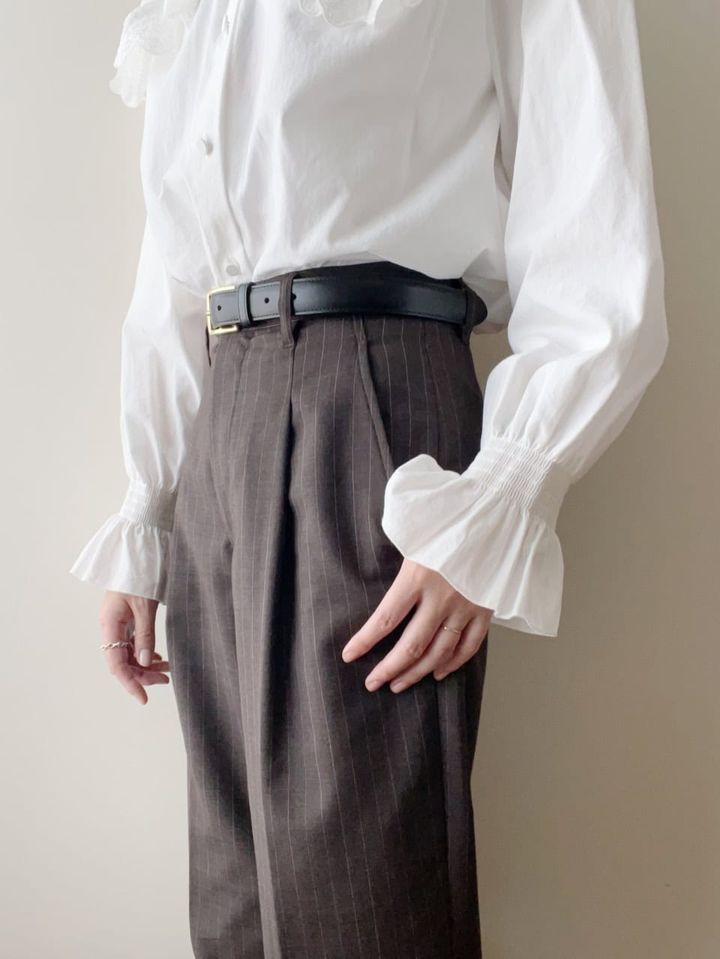 「お気に入りのおじさんスラックスはShinzoneのアーカイブコレクション。ほどよい渋さのパンツに、甘いブラウスを合わせてバランスを取りました。スラックスやシャツを使ったスタイリングには、キャップやスニーカーの小物でカジュアルさをプラスするのが定番です」