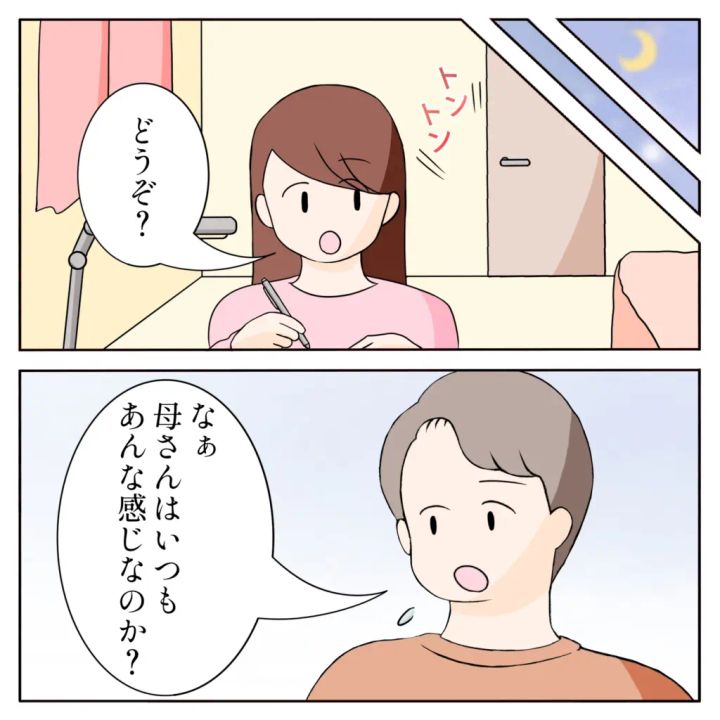 夕飯の後、部屋で勉強していると父が「なぁ母さんはいつもあんな感じなのか?」と聞きに来ました。