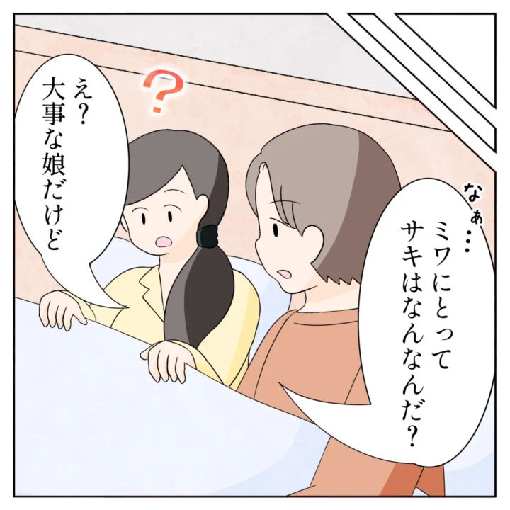 「なぁ、ミワにとってサキはなんなんだ?」夫に言われたお母さんは「え?大事な娘だけど」とキョトンとして言いました。なぜそんな質問をされるのか、全く見当がつかない感じです。