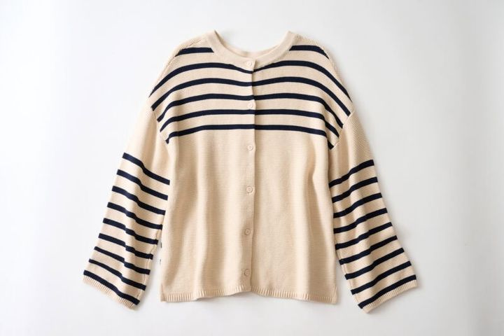 ボーダーの配置が個性的なコットンニットは、前後2wayで着られる便利アイテム。ボタン側を後ろにすると、背中にアクセントが生まれておしゃれ感もアップ。「白いスカートを合わせたり、パンツならワイドめがいいバランス。カーディガンとして、ワンピースにさらっとはおってもさまになり、着回しできるのが嬉しい1着です」(平井さん)