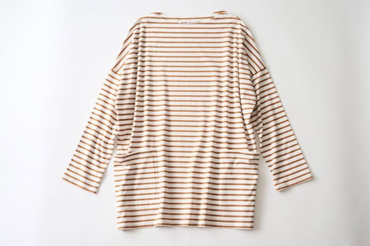 秋のコーディネートに一役買う、ブラウンのボーダーカットソー。「丈が長めで、ゆったりしたデザインながら、前面のポケットでIラインを作っているので、すっきりした印象に。ネイビーのワイドパンツなどを合わせて、リラックス感のある着こなしに」(平井さん)
