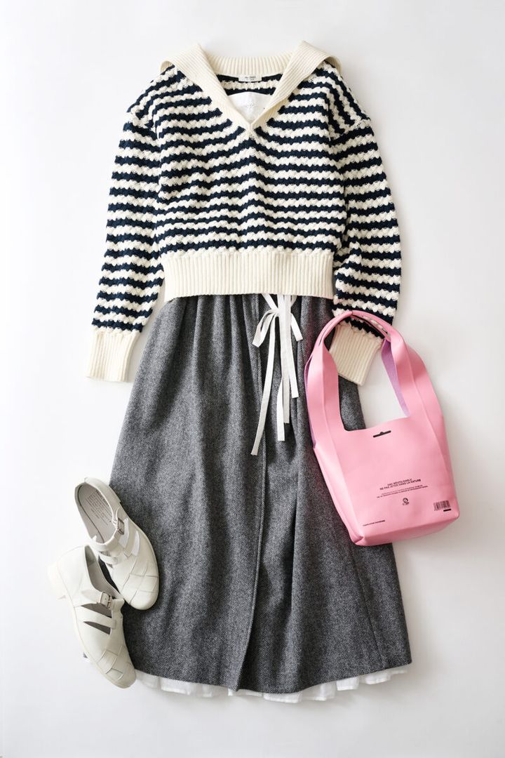 顔まわりを華やかに見せてくれるセーラーカラーが印象的なボーダーニット。「デニムを合わせるのも良いけれど、こんなふうにツイードのボトムを選ぶと、秋っぽくまとまります。モノトーンスタイルにはカラフルな小物でアクセントを。ピンクのバッグがこなれた雰囲気に見せてくれます」(平井さん)