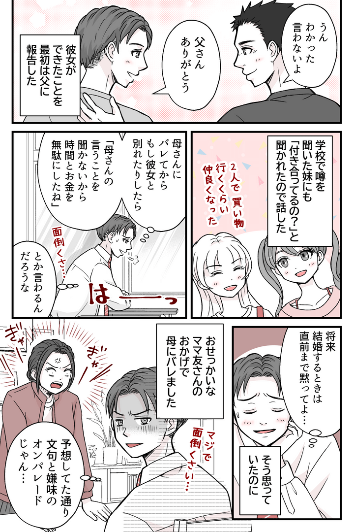 母に彼女ができたことを報告しなかったのは、面倒なことになるとわかっていたからです。自分の好みじゃなければ、別れるようにいろいろな嫌味を言ってくると思います。それでも言うことを聞かなかったら、別れるまでなんだかんだ理由をつけて、会いに行く時間を奪うでしょう。