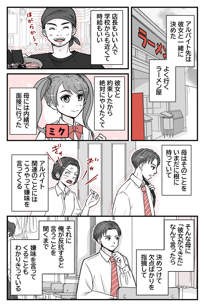 俺はレンキ(高校2年生)。家族は父に母、そして妹のユウカ(高校1年生)です。高校1年生のときに同級生のミクに告白され、俺も好きになり付き合っています。俺と彼女は同じアルバイトもはじめて、一緒に帰ったり、休みの日はデートをしたりしています。3年生になったらもっと勉強にも力を入れて、2人で同じ大学に行くことが目標です。けれど彼女がいることを母には言っていません。母はとても口うるさく、報告したところでさらに何か言ってくるに違いないから……。