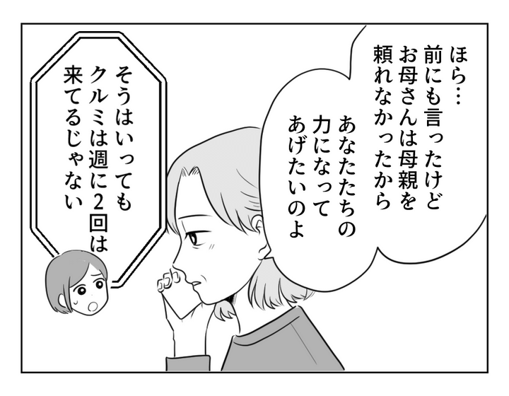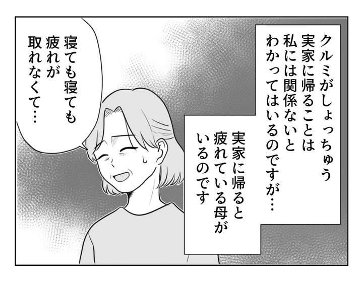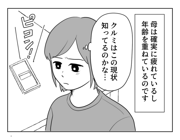 アンナさんにとって、クルミさんが頻繁に実家に帰ることは関係ない話です。そのこと自体はしっかりと理解していても、たまに会いに行くたびに「疲れた」を連呼する実母さんを、ゆっくり休ませてあげたいと思うことは悪いことではありません。するとタイミングよくクルミさんから連絡が! 会ったら一度しっかりと、実家に行く頻度について話さないとな……そんな風に思うアンナさんなのでした。
