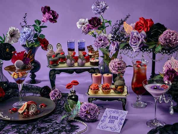 アフタヌーンティーには、ブランドを象徴するパープルを基調にしたスイーツやセイボリーがずらり。「パープルモンブランマフィン」「レッドリップのチョコロリポップ」「黒猫TITIのブラックバーガー」など、遊び心あふれるアイテムが並びます。ドリンクは、幻想的な紫のカクテル「ファンタジーブルーム」や真紅が美しい「スカーレットロマンス」の2種類が登場。さらに、蝶モチーフやバイオレットゼリーをあしらった華やかな「アナ スイ ファンタジーパフェ」も見逃せません!