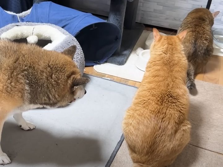 水飲み場が渋滞! 猫さんに順番を譲るやさしい柴犬さん