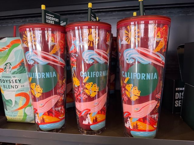 マグカップと同じく、プラスチックタンブラーもカリフォルニア限定で販売されていました。赤を基調とした鮮やかなデザインで開放的な雰囲気のイラスト。カリフォルニアの豊かな自然や、アクティブで自由なライフスタイルも感じられます。
