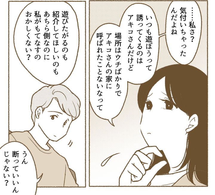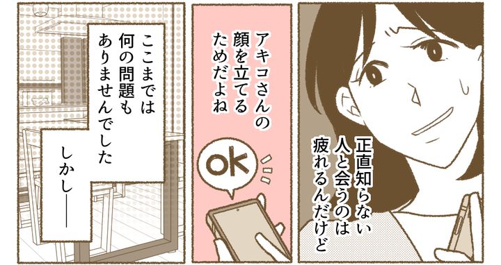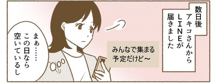 アキコさんは「一度みんなで会ってみよう」と言います。正直気は乗りませんが、「気が合わないならムリしなくていい」とも言ってくれたので、アキコさんの顔を立てるためにも一度だけ会ってみようと思います。