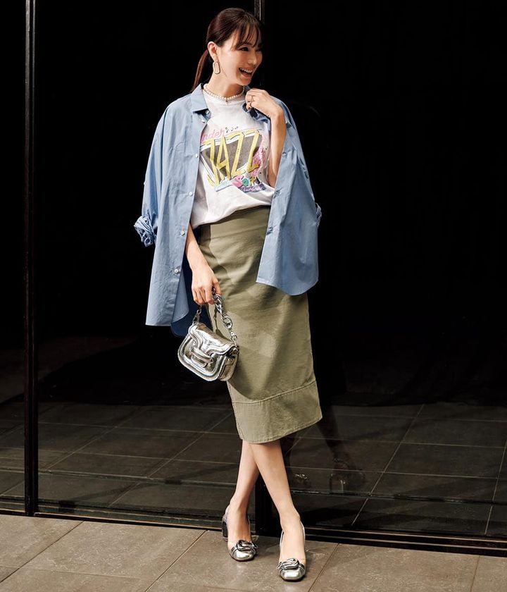 Tシャツ¥6,380(GOOD ROCK SPEED/グッドスピード)シャツ¥36,300(ATON/エイトン青山)タイトスカート¥55,000(マディソンブルー)バッグ¥152,900(ピエール アルディ/ピエール アルディ 東京)パンプス¥224,400(クリスチャン ルブタン/クリスチャン ルブタン ジャパン)ピアス¥22,000(ブランイリス/ブランイリス トーキョー)ネックレス¥101,200チャーム¥188,100(ともにビジュードエム/ビジュードエム六本木ヒルズ)ダブルリング¥40,700(リューク)