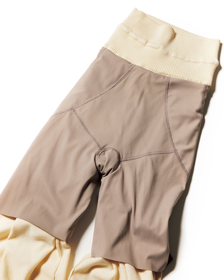 特徴:ソフトガードル内蔵で、気軽にボディケアが可能。ハイウエスト部分はリブ仕様でお腹を包み込み、冷えからも守ってくれます。