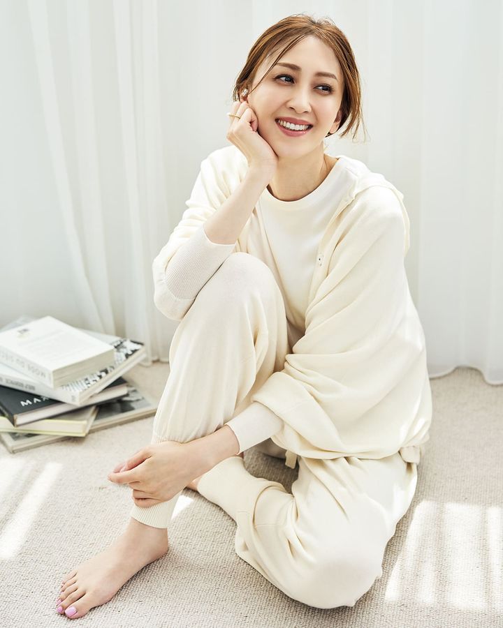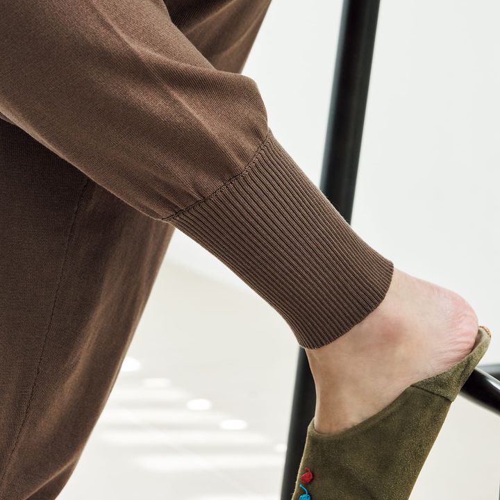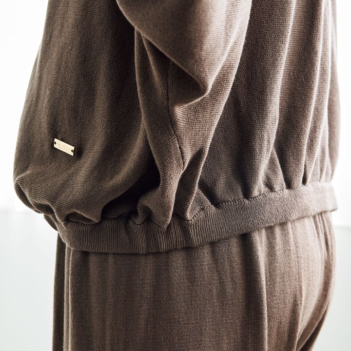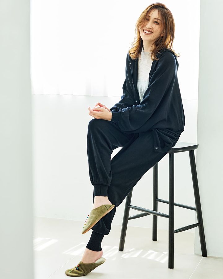 思わずスリスリしたくなる、しなやかな風合いのシルクプロテイン加工のニットアップ。パーカはドルマンスリーブのほどゆるシルエット。パンツは冷えやすいお腹をカバーするハイウエストリブ&ヒップアップ効果が期待できるガードル付き。楽チンで、スタイルも良く見えて、それでいて着回しもしやすい、三拍子揃ったニットアップです♪フーディー ¥13,750 パンツ ¥16,940(ともに+FT SUPREME.LA.LA.)ニット ¥44,000(ルームエイト/オットデザイン)ルームシューズ/スタイリスト私物