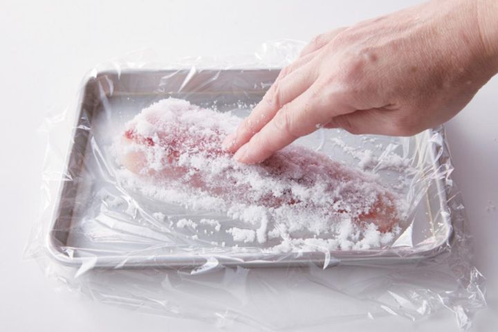 ❶たいはラップの上にのせ、全体に粗塩をまぶしてぴったりと包み、1〜2晩おいて水分を抜く。