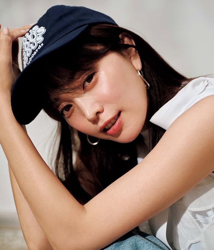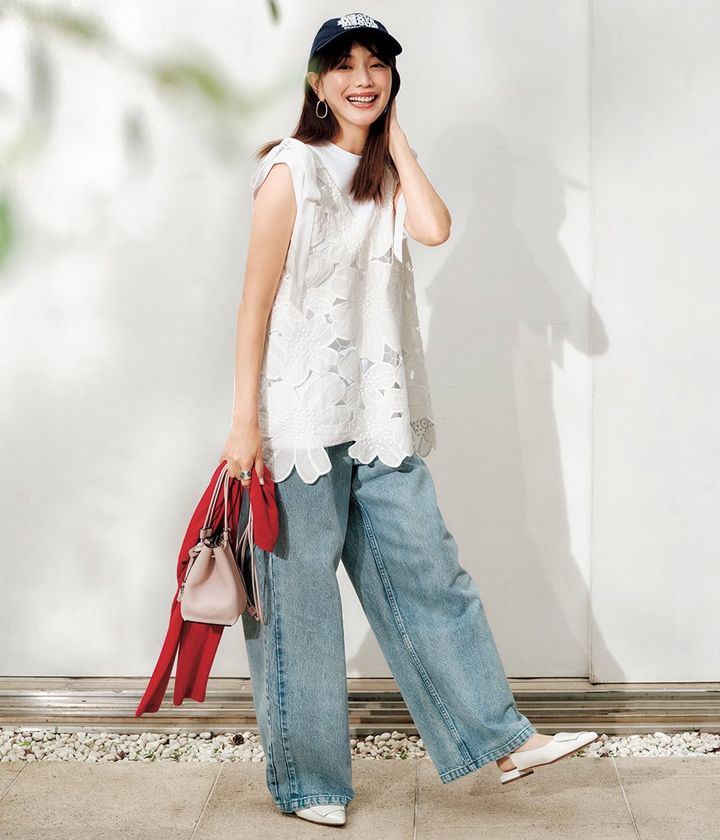 キャミソール¥39,600(venit/ノーブル 有楽町マルイ店)ノースリーブトップス¥11,550デニムパンツ¥47,300〈ともにサードマガジン〉キャップ¥8,800〈ビズ スケートボーズ〉(すべてサードマガジン)手に持ったニット¥49,500(ATON/エイトン青山)バッグ¥152,900(トッズ/トッズ・ジャパン)パンプス¥36,300(ファビオ ルスコーニ/伊勢丹新宿本店 本館2階 婦人靴)ピアス¥39,600(リューク)リング¥68,200(ブランイリス/ブランイリス トーキョー)