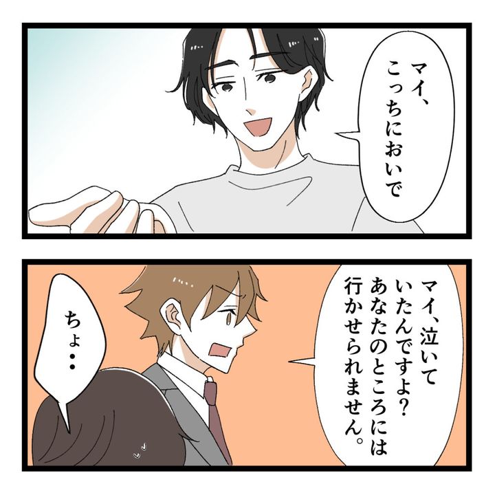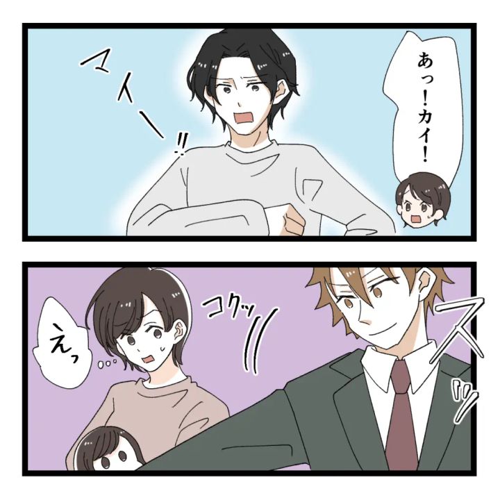 3年同棲し結婚の話しもしていたのに、浮気相手のアユミさんとの子どもができ、マイさんを捨ててアユミさんとの結婚を選んだヒロトさん。その後、マイさんは誠実でイケメンな男性カイさんと出会い結婚し、子どもも生まれ幸せな毎日を送っていました。一方のヒロトさんは、アユミさんが家事育児に積極的ではなく仕事、家事、育児に追われる毎日で疲弊していき「マイと結婚していたら」とマイさんのことを何度も思い出していました。時が経ち、道で幸せそうなマイさん家族を見かけたヒロトさん。その後、息子のソウくんが通っている保育園でカイさんが「僕、今日がお迎え最後で」と先生に話しているのを聞き、勝手にマイさんたちの夫婦仲が良くないと思い込んだヒロトさん。数日後、ヒロトさんは偶然マイさんに会うと「俺が力になる」「別れたことを後悔していた」などと言い、マイさんが「困ってないし助けもいらないし、話もしたくない」と言っても「強がらなくていいよ」と聞く耳を持ちません。話の通じないヒロトさんにマイさんが恐怖を感じていると、遠くから「マイ~!」と誰かが呼ぶ声がしました。
