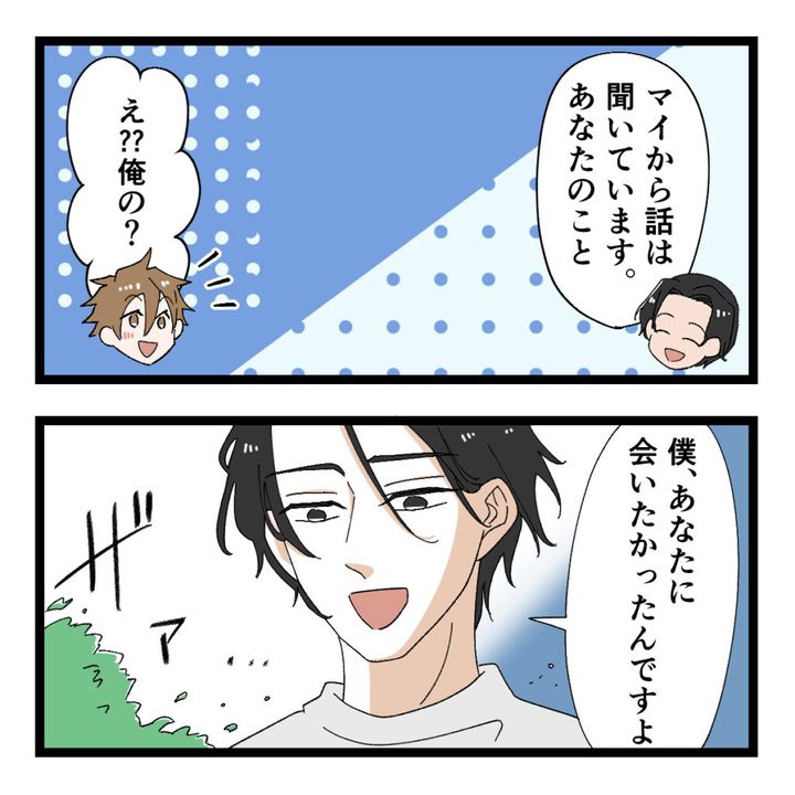 マイさんが夫のカイさんに泣かされていると勝手に思い込んでいるヒロトさんは、カイさんからマイさんを守ろうとします。マイさんを心配して走ってきたカイさんに「初めまして。マイの元カレです」と挨拶すると、自分がマイさんを怖がらせているとは知らず「あなたのところには行かせられません」と言い出します。怯えるマイさんを見て何となく状況を察したカイさんは、「マイからあなたの話は聞いています。僕、あなたに会いたかったんですよ」とヒロトさんに笑顔を向けました。